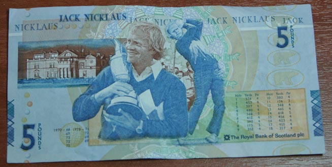 Лицевая сторона обычная, как и на всех пятерках, а вот задняя сторона, где обычно всякие замки рисуют отличается. На этой бумажке нарисовали Jack’a Nicklaus’a, который, как выяснилось, очень известный ветеран гольфа. Недолгий поиск по сети дал, что ему уже за 60.. и он все еще жжоотт как двадцатилетний -)